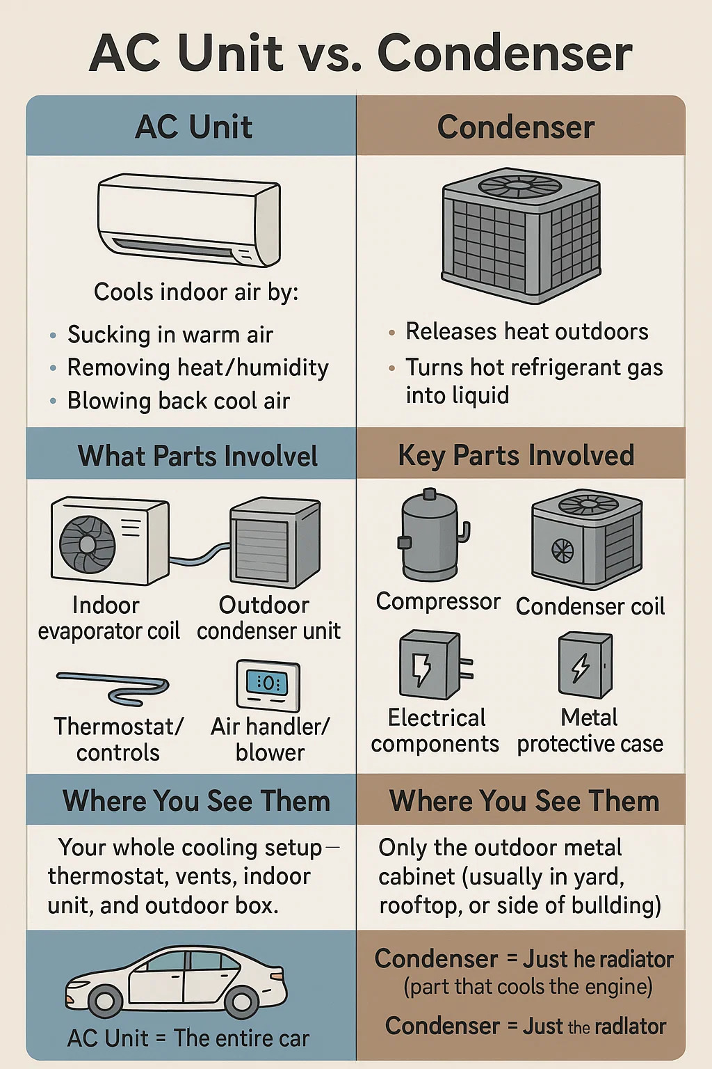 কনডেন্সার: AC ইউনিটের মাত্র একটি অংশ—বিশেষ করে, বাইরের ধাতব বাক্স যা তাপ প্রকাশ করে।